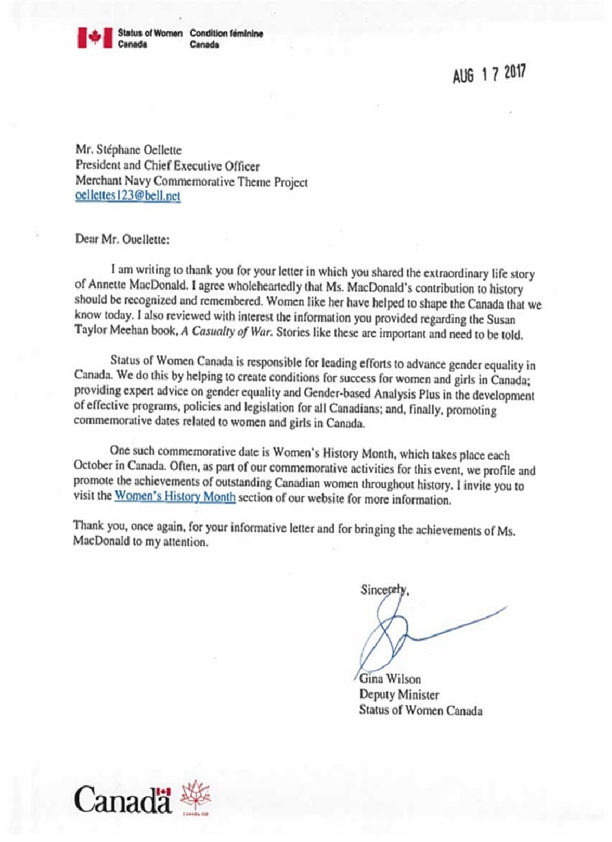 OTTAWA, TODAY – Mr. Stéphane Ouellette, President and Chief Executive Officer of the Merchant Navy Commemorative Theme Project (MNCTP), paid tribute to Lieutenant Annette “Nettie” MacDonald, a Second World War U.S. Army Nurse and proud Canadian from Williamstown, Ontario, as part of Women’s History Month in Canada.