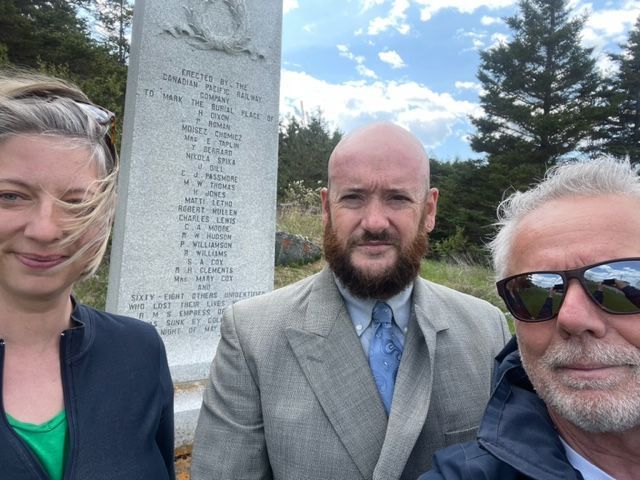 Mr. Stéphane Ouellette, President and Chief Executive Officer, Merchant Navy Commemorative Theme Project (MNCTP), Mr. Christian Pomerleau, President, Pomerleau Les Bateaux Inc., joined Ms. Hélène Théberge, Director, Pointe-au-Père Maritime Historic Site, to lay a wreath at the Memorial to the Sinking of the Empress of Ireland