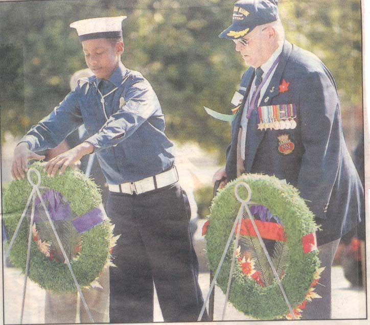 (FROM LEFT): Navy League of Canada Sea Cadet and MNV Willis Marsolais, laying a wreath at the Merchant Navy Veterans' Day Commemoration at the National War Monument, Ottawa, September 3, 2004.